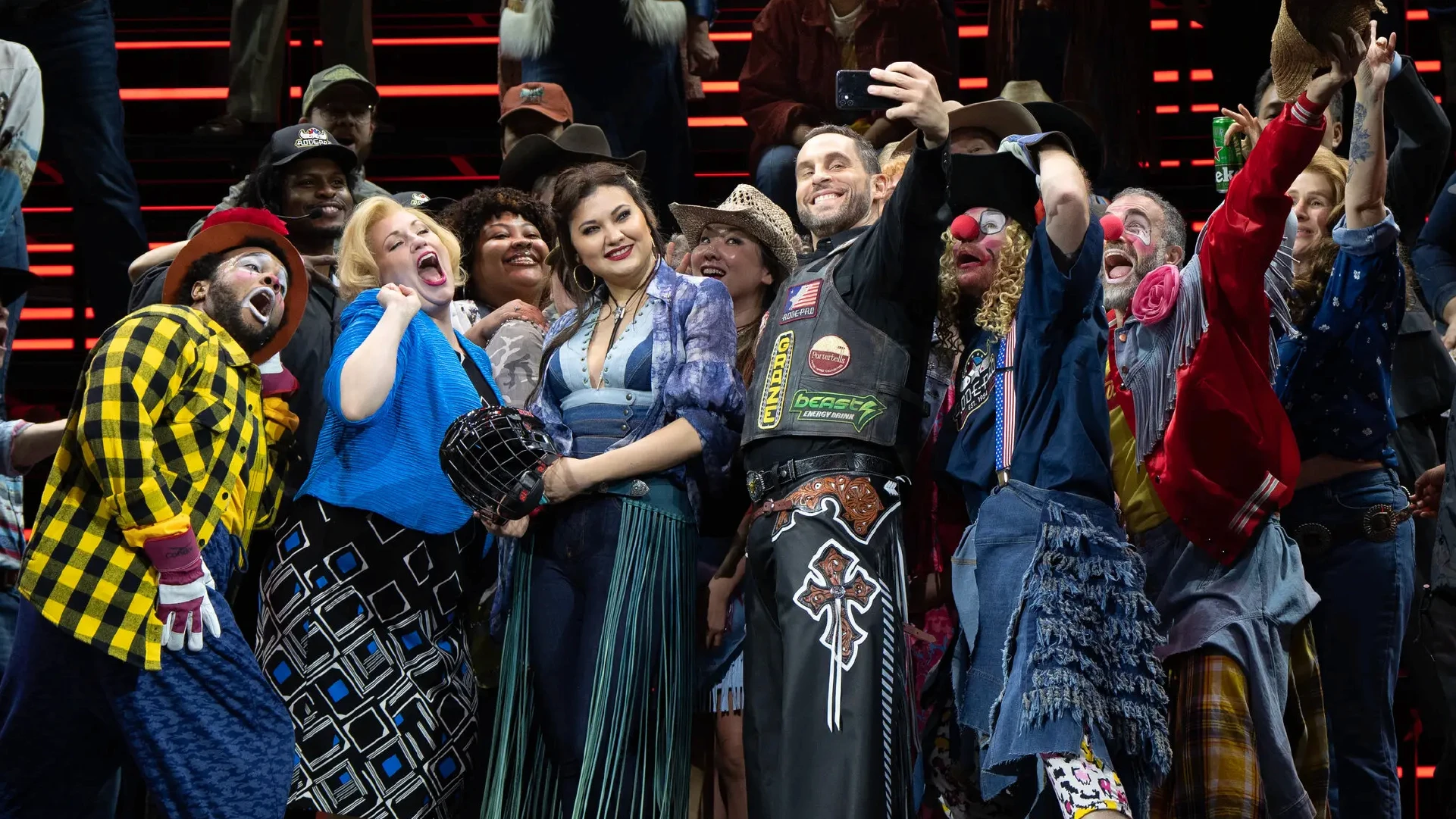Rodeo-inspired branding, reinforcing Escamillo’s modernised persona as a commercialised rodeo star.